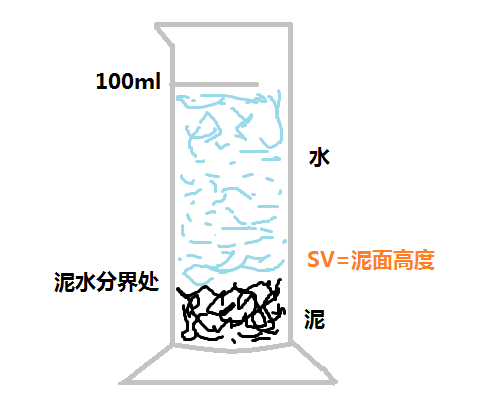 SV很容易测定,但是结果不能完全反应污泥性质和数量。城市污水处理厂的正常SV值一般在20%~30%之间,而有些工业废水处理厂的正常SV值在90%以上。因此每个污水厂都应该根据自己的运行经验确定本厂的最佳SV值。SV用图解释如下: